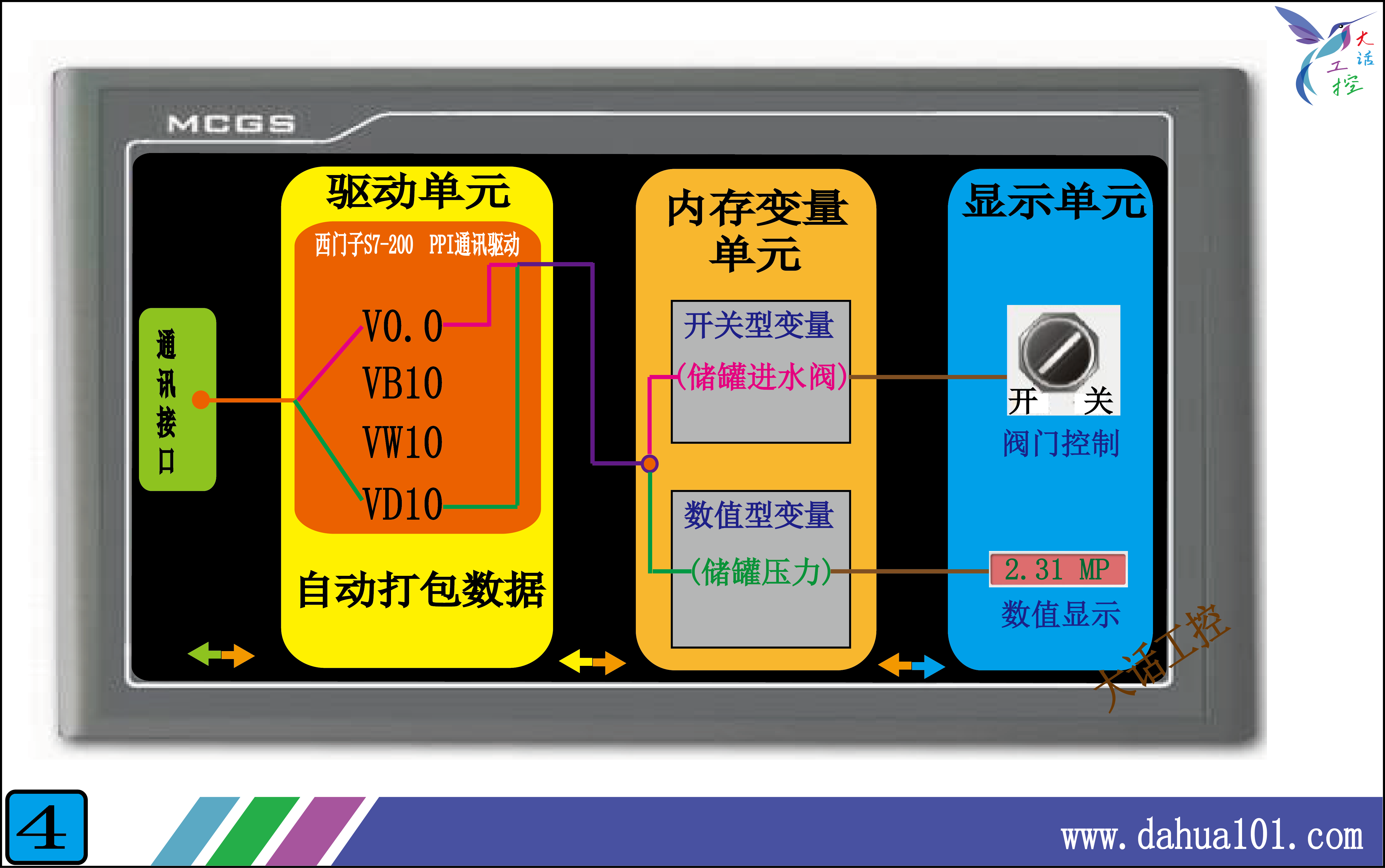 3,内存变量单元:这一单元也是触摸屏厂家内置的,它实际上就是一块存储区,它里面可以存放各种各样的数据,存放的数据类型大致可以分为数值型,开关型,字符型,特殊型。