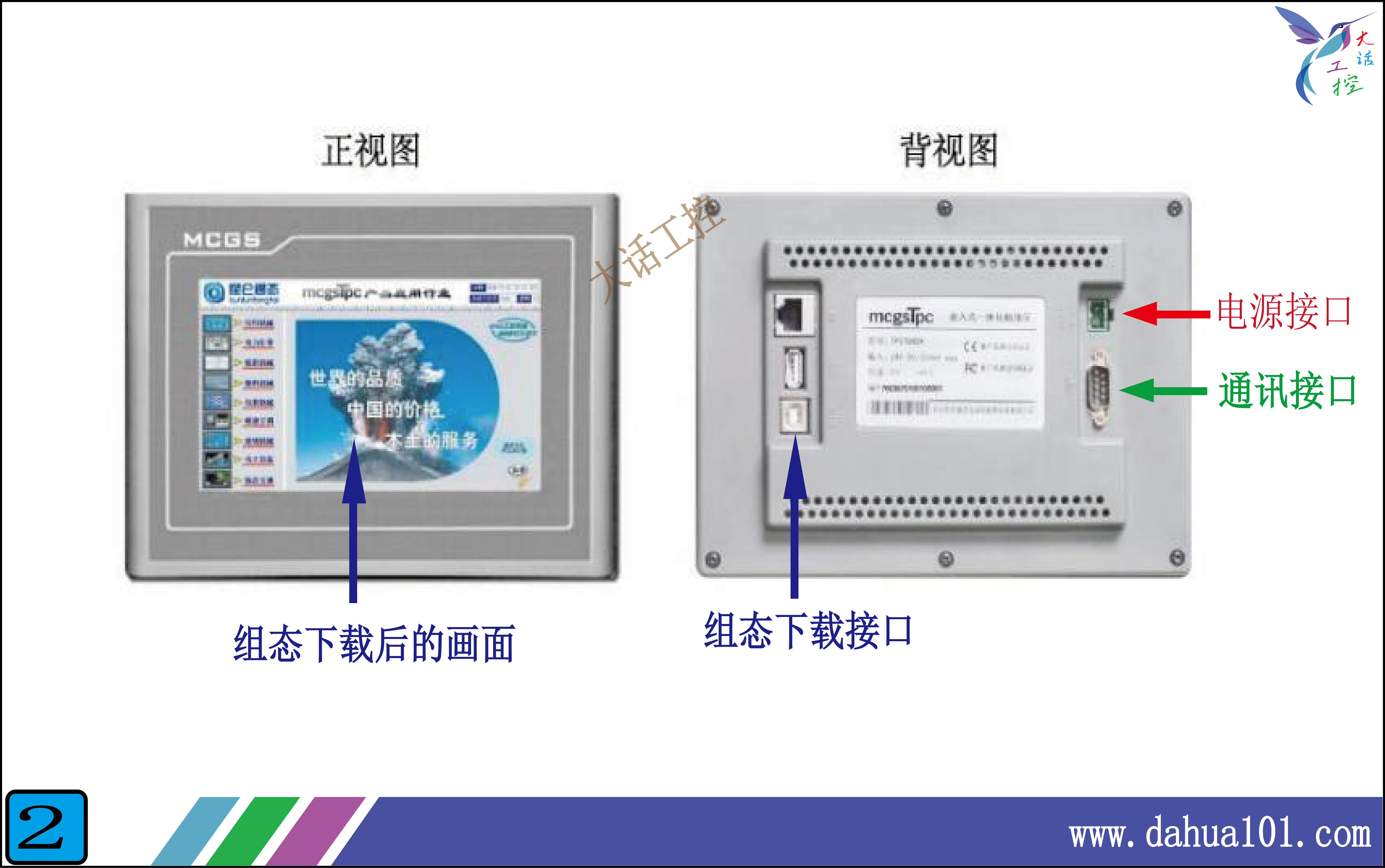 那触摸屏和PLC通讯的原理是什么样的呢?看下面的图2,这是一个真实的触摸屏的正面和背面,正面不用说了,就是显示面。主要看一下背面,有3个接口。