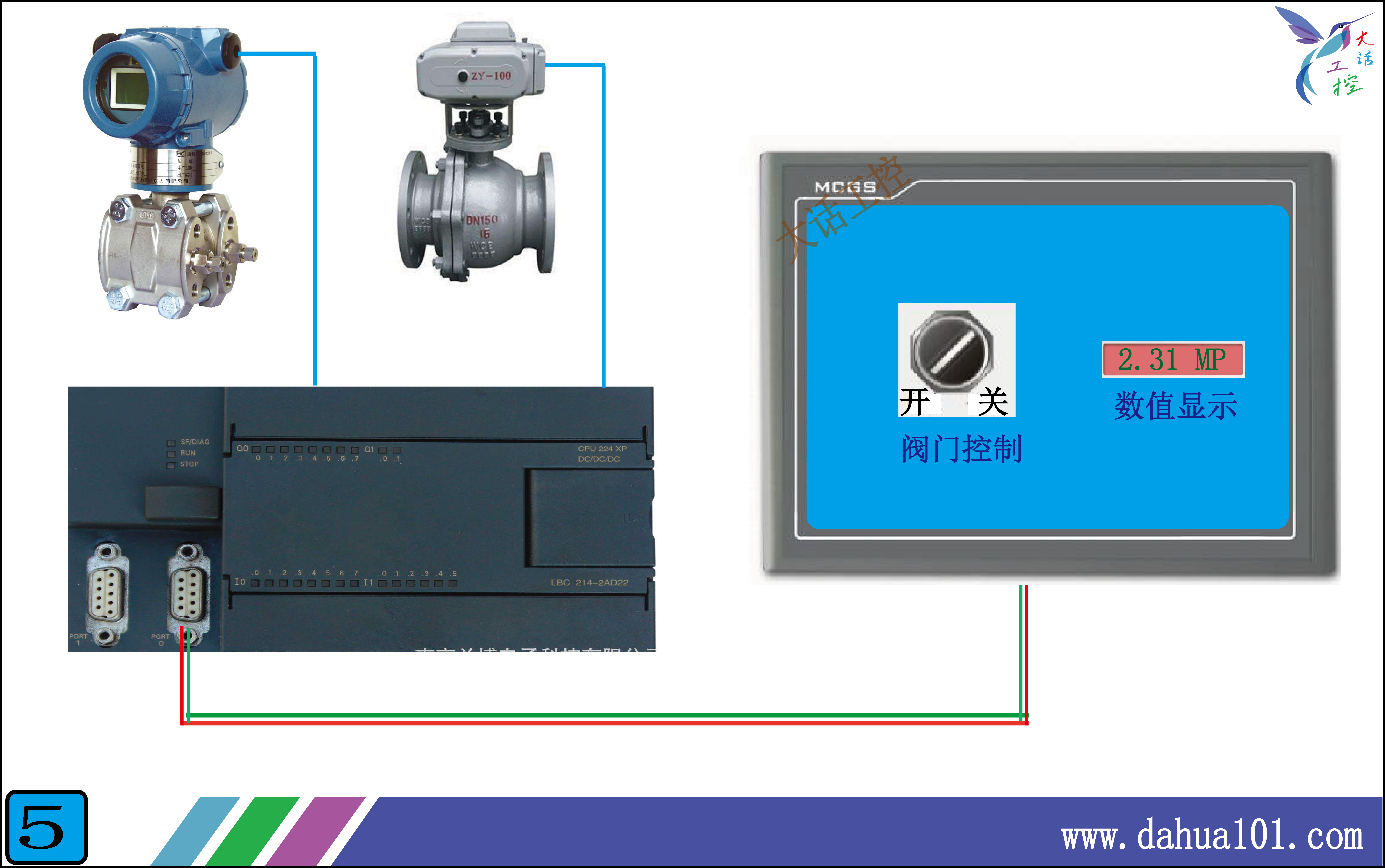 图4要实现的功能是,触摸屏和西门子S7-200PLC连接,1,在触摸屏上可以显示PLC里的一个压力数值,。2,可以通过触摸屏上的一个开关部件,控制PLC里的一个开关量。