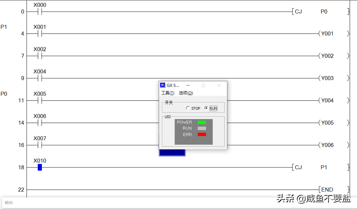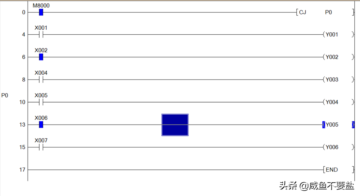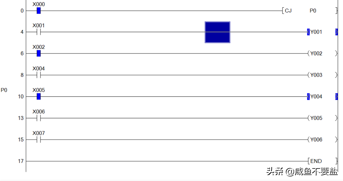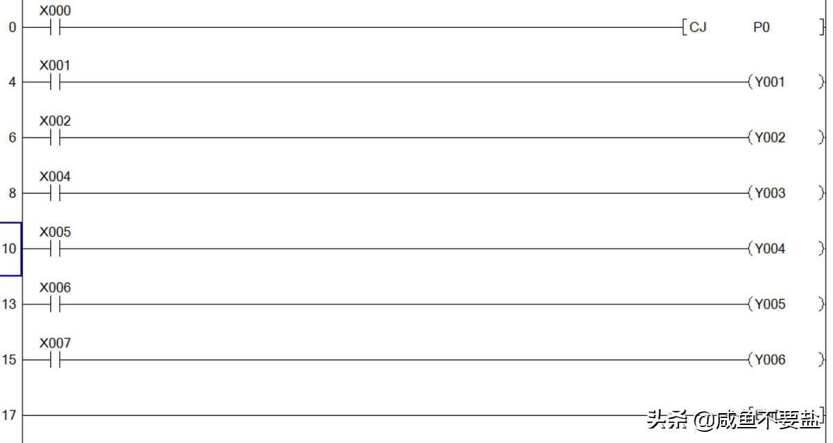 注意:PLC只有有条件跳转指令,没有无条件跳转指令,若想得到无条件跳转指令可以使用M8000(运行监视,只要PLC处于run运行状态,则M8000就会一直接通)。例: