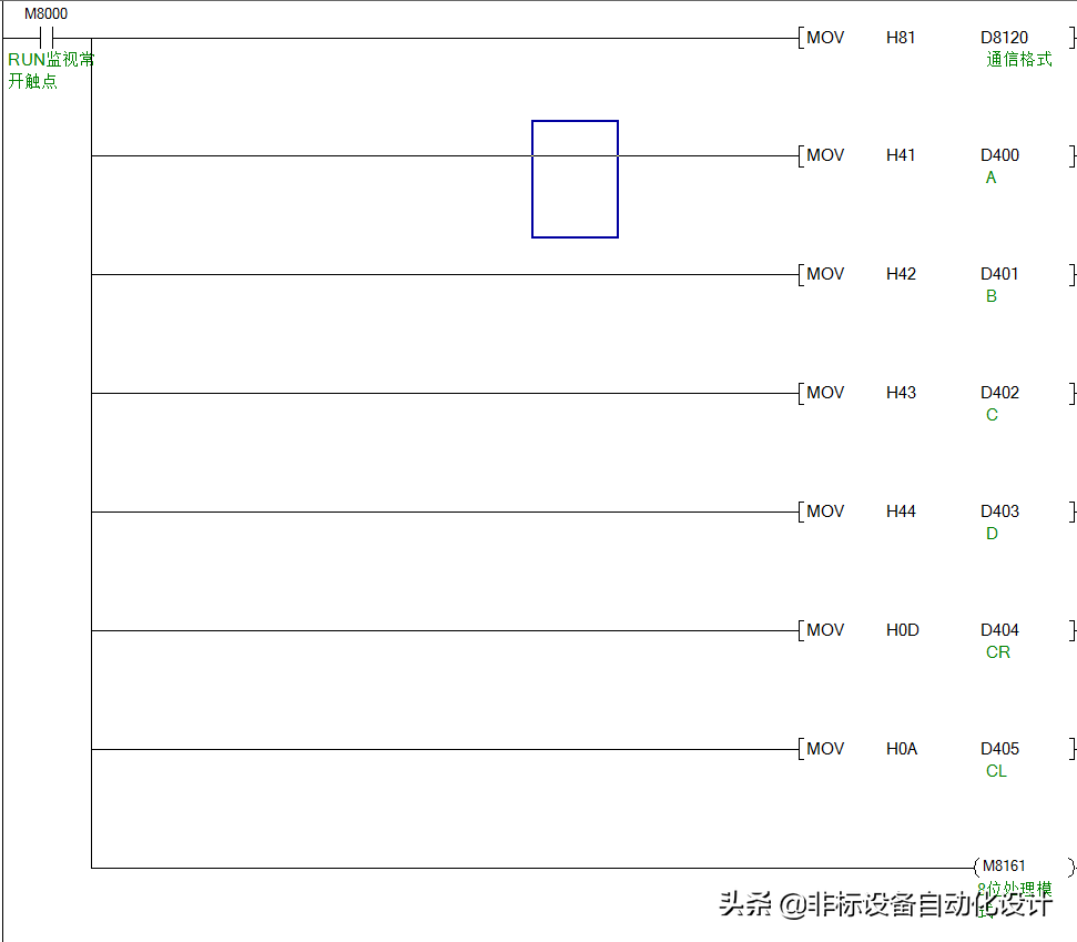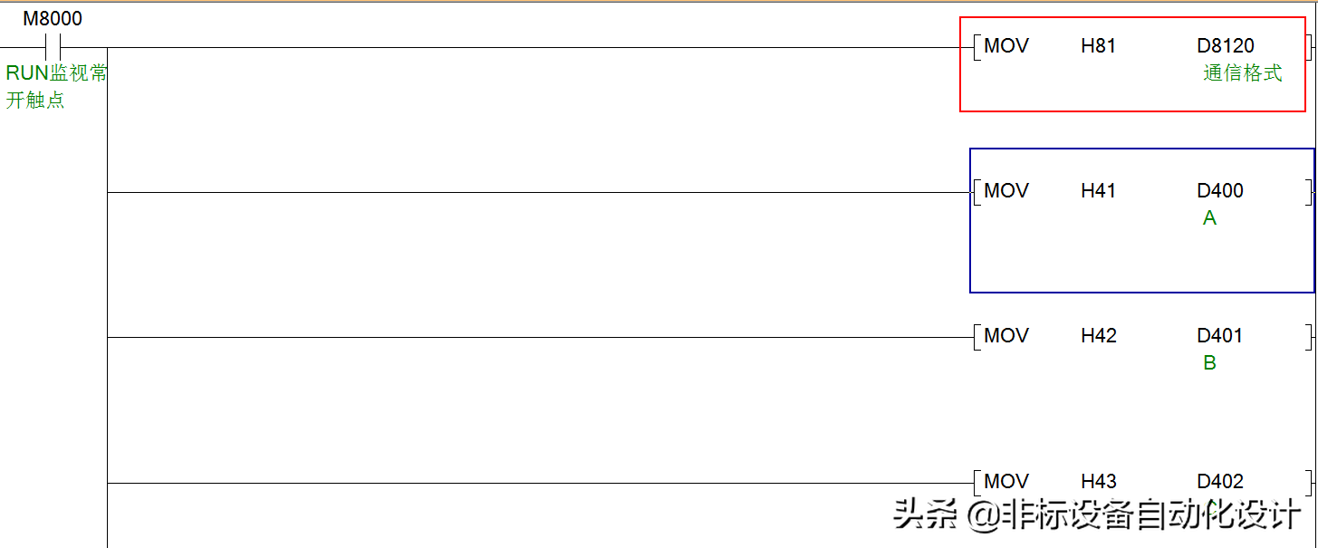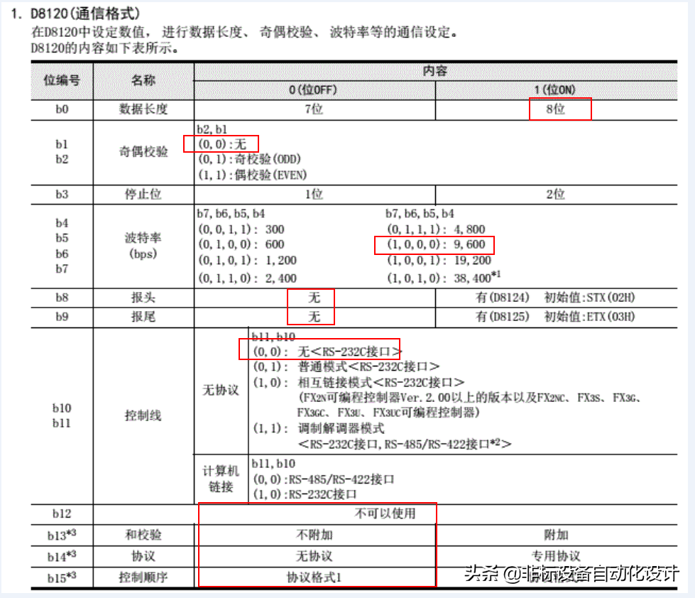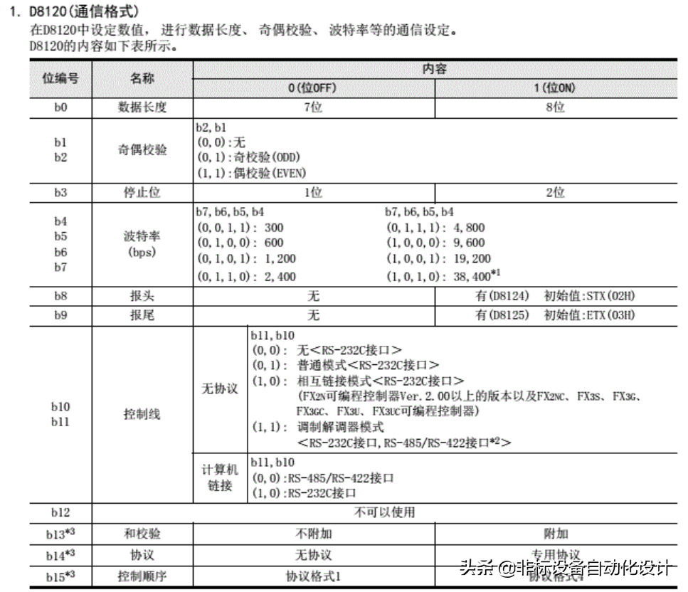 下面是PLC通讯参数的设定,收发数据需要用RS指令,通讯参数在D8120设置