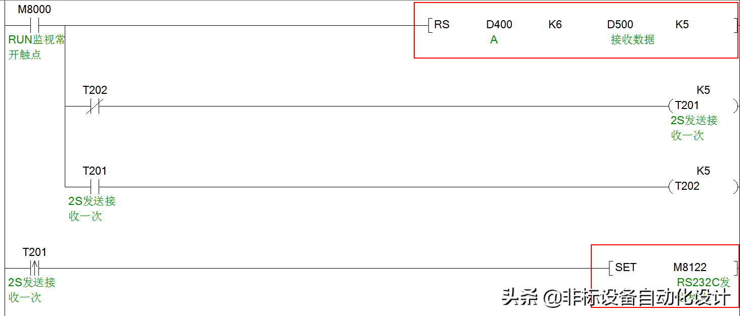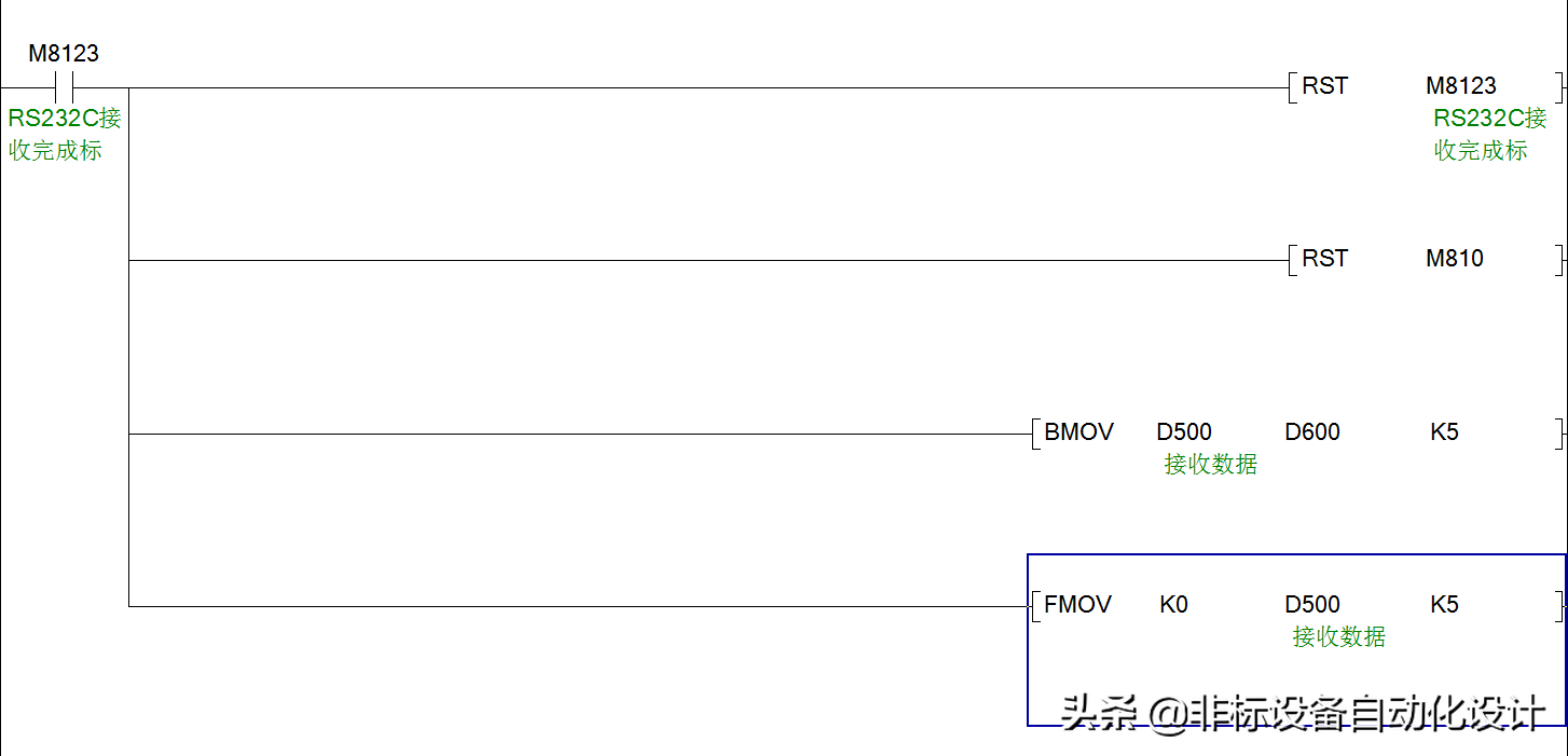 如下图的M8123是数据接收完成标志,外部有数据发送到PLC时,M8123就会通,M8123一通就把数据转存到D600开始的地址中。