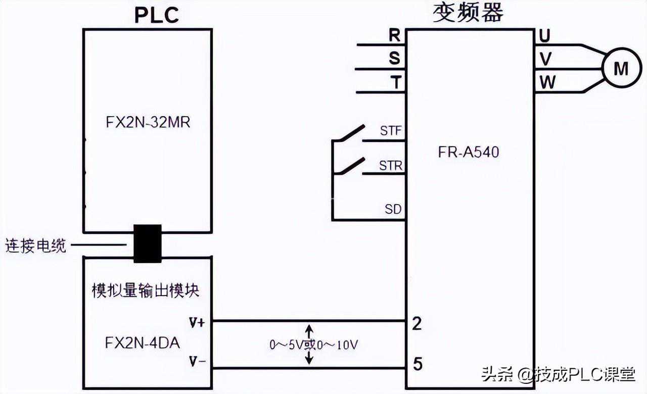 PLC以模拟量方式控制变频器的硬件连接如下图所示,由于三菱FX2N-32MR型PLC无模拟量输出功能,需要给它连接模拟量输出模块(如FX2N-4DA),再将模拟量输出模块的输出端子与变频器的模拟量输入端子连接。当变频器的STF端子外部开关闭合时,该端子输入为ON,变频器启动电动机正转,PLC内部程序运行时产生的数字量数据通过连接电缆送到模拟量输出模块(DA模块),由其转换成0~5V或0~10V范围内的电压(模拟量)送到变频器2、5端子,控制变频器输出电源的频率,进而控制电动机的转速,如果DA模块输出到变频器2、5端子的电压发生变化,变频器输出电源频率也会变化,电动机转速就会变化。