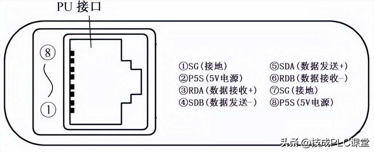 三菱FR500系列变频器有一个用于连接操作面板的PU口,该接口可用作RS485通信口,在使用RS485方式与其他设备通信时,需要将操作面板插头(RJ45插头)从PU口拔出,再将RS485通信电缆的一端插入PU口,通信电缆另一端连接PLC或其他设备。三菱FR500系列变频器PU口外形及各引脚功能说明如下图所示。