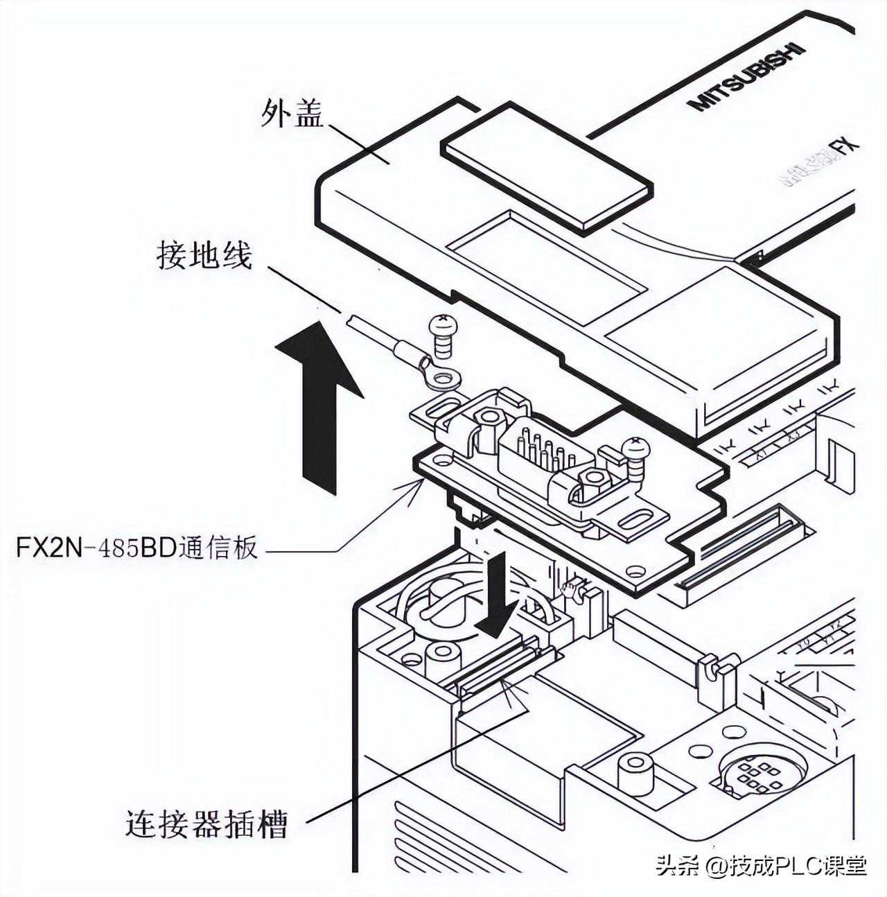 三菱FXPLC一般不带RS485通信口,如果要与变频器进行RS485通信,须给PLC安装FX2N-485BD通信板。485BD通信板的外形和端子如下图(a)所示,通信板的安装方法如下图(b)所示。