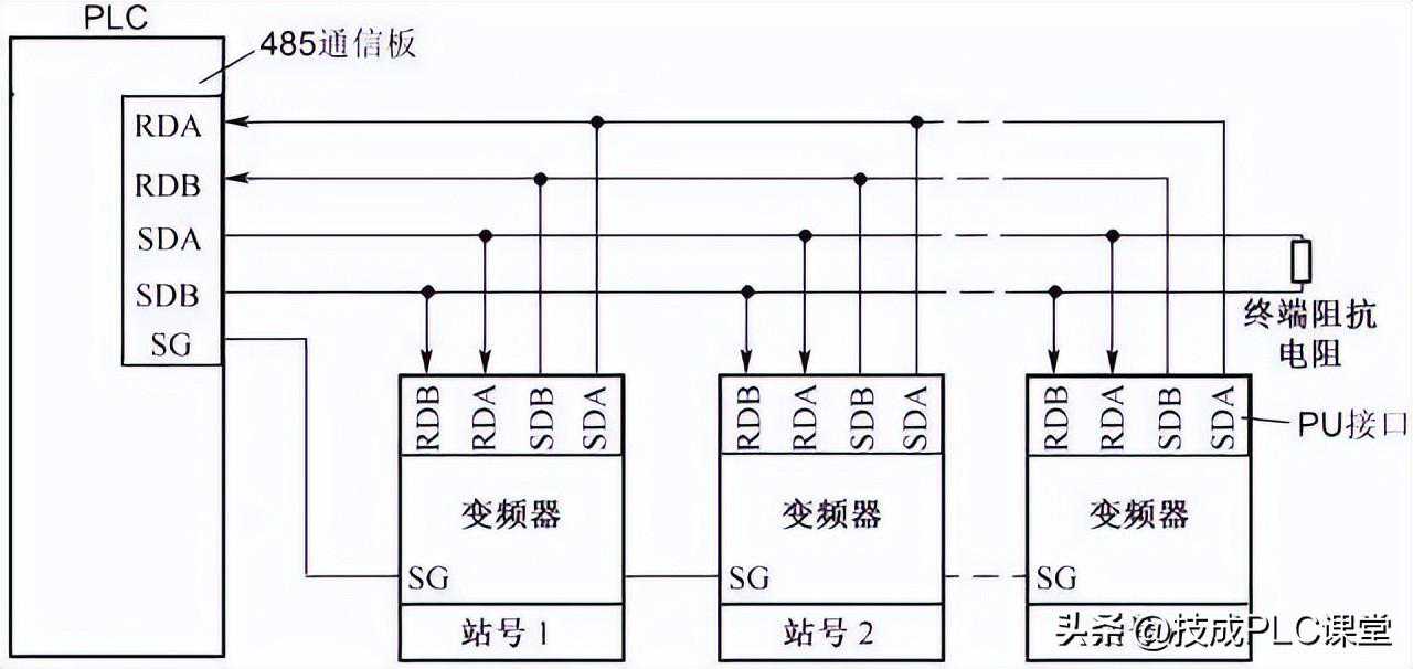 多台变频器与PLC的RS485通信连接如下图所示,它可以实现一台PLC控制多台变频器的运行。