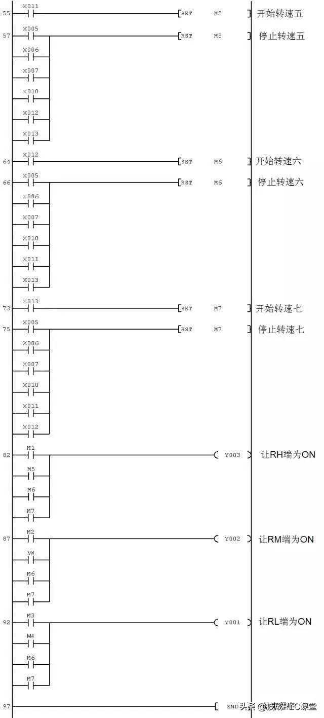 PLC以开关量方式控制变频器驱动电动机多档转速运行的PLC程序如下图。