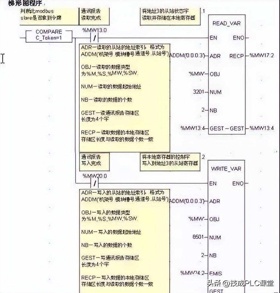 时间令牌:为了实现系统的可扩展性,容许带多个变频器,而在PLC的每个扫描周期最多只能有8个通信模块(READ_VAR/WRITE_VAR)同时处于通信激活状态,那么要控制多个变频器时,需要对变频器进行分时控制,这里设置时间令牌就是为了让多个变频器轮流通信。