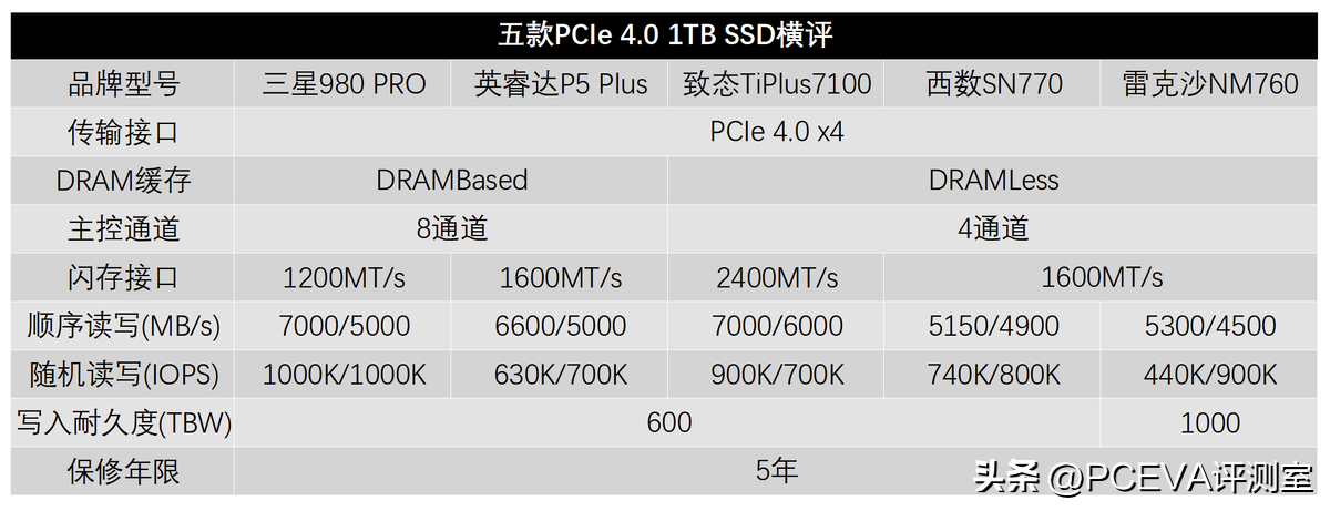 五款横评产品中有两款属于DB有缓存方案:三星980PRO是最早问世的原厂,采用8通道主控搭配三星第六代V-NAND闪存,闪存接口速率1200MT/s。