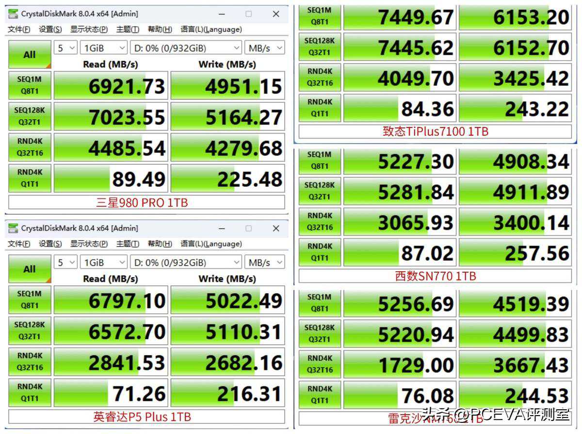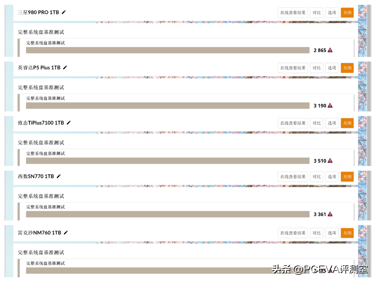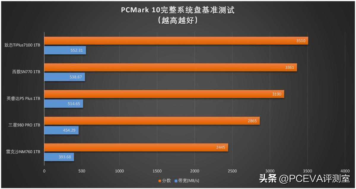 PCMark10完整系统盘基准测试成绩从高到低分别是:致态TiPlus71001TB、西数SN7701TB、英睿达P5Plus1TB、三星980PRO1TB、雷克沙NM7601TB。