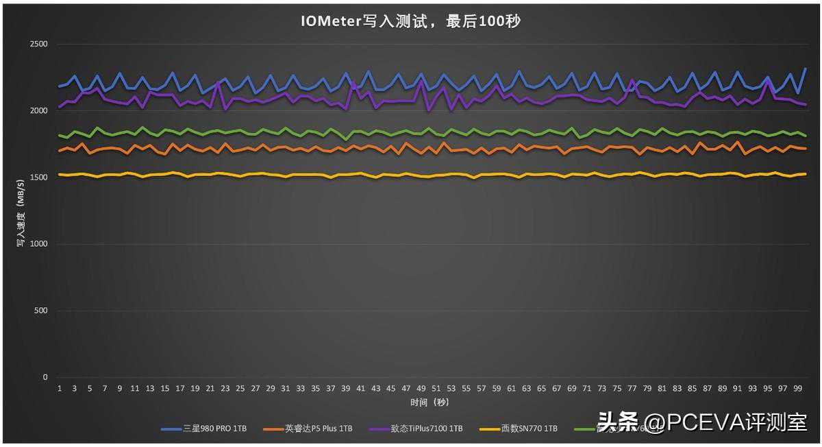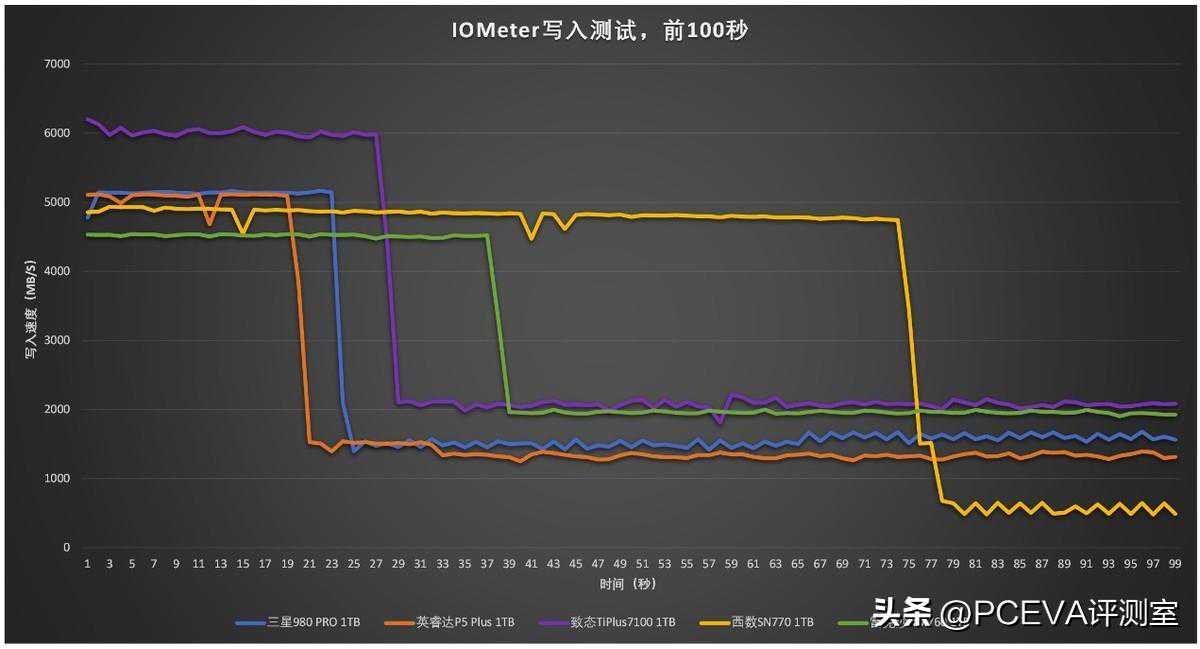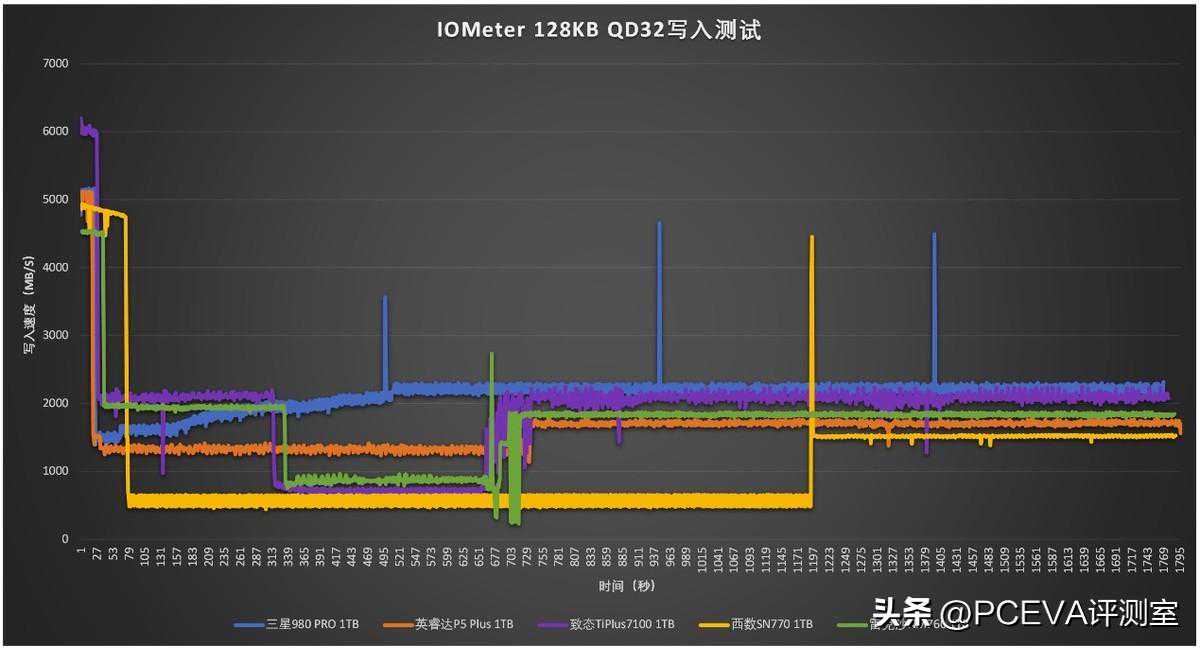 在1800秒IOMeter测试的初始阶段可以看到各盘的SLC缓存内写入速度:最快的是致态TiPlus71001TB的6030MB/s,其次是三星980PRO1TB的5140MB/s、英睿达P5Plus1TB的5130MB/s,最后是西数SN7701TB的4905MB/s和雷克沙NM7601TB的4528MB/s。