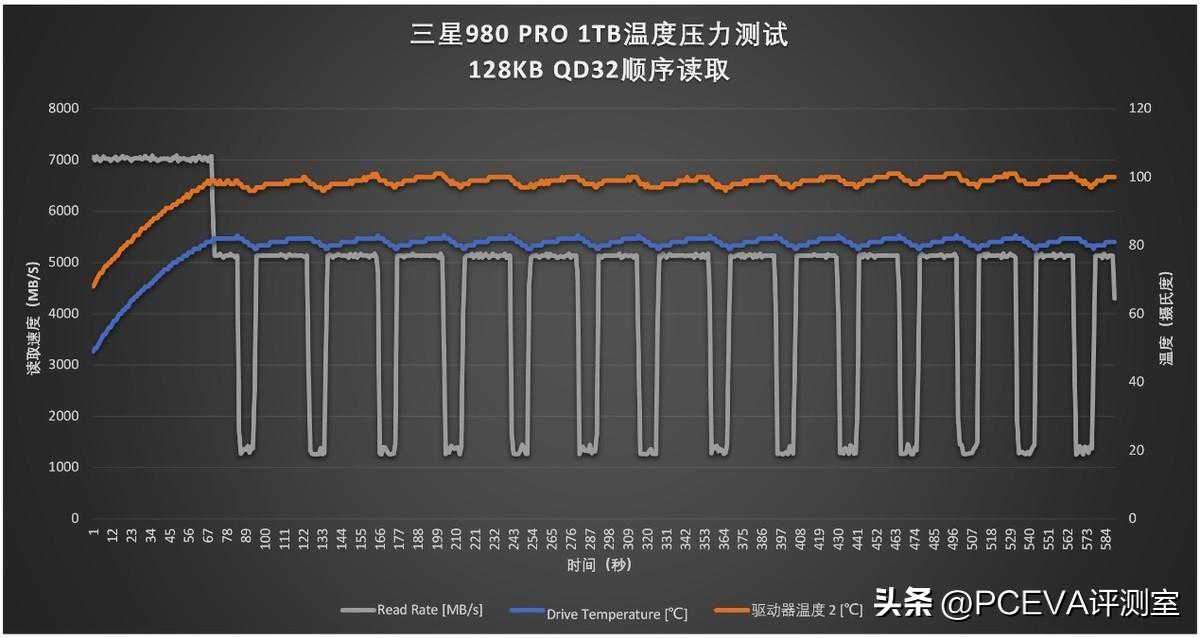 三星980PRO的温控逻辑较为清晰,当闪存温度达到82度后读取限速5135MB/s,如果主控温度达到100度,则读取限速进一步收紧到1350MB/s。在温度压力测试的后半段,读取速度基本就是在这两个温度之间来回切换。