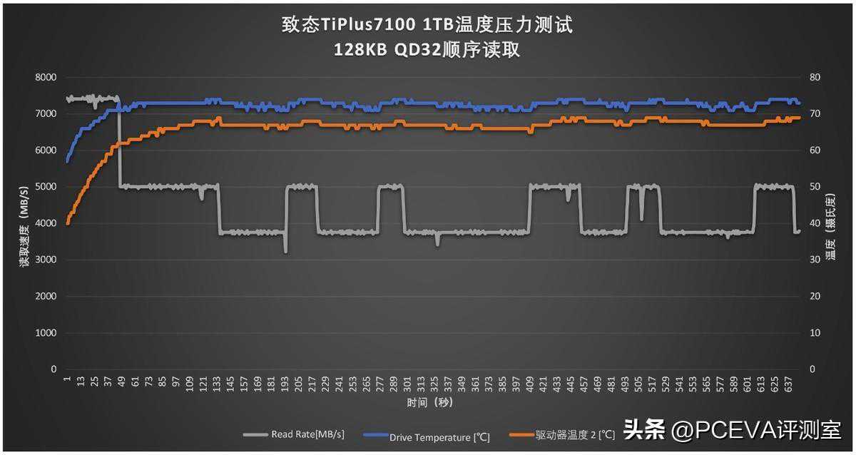 致态TiPlus7100在温度达到73度后进入限速1(大约5000MB/s),达到75度后进入限速2(大约3758MB/s)。在测试过程中代表闪存温度的温度2最高只有69度。