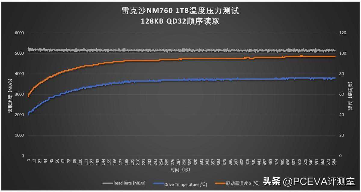 雷克沙NM760是五款SSD当中温度表现最好的一个,在10分钟满载压力测试过程中没有发生过热限速。NM760使用的复合材质标签能够起到增大散热面积的作用,在这里提供了很大的帮助。