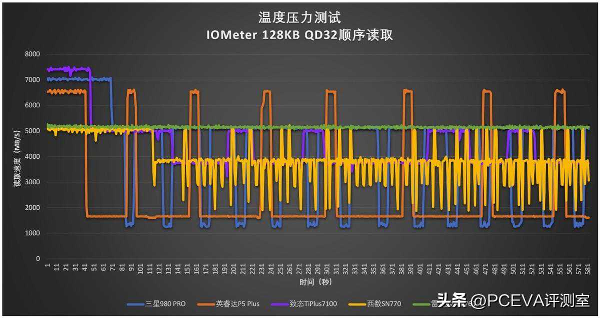 温度压力测试是本次横评中唯一在被动散热条件下进行的测试项目,其目的是通过满负荷读取考验SSD在不利散热条件下的温控算法。优秀的温控算法应该能够在保障温度不超过安全范围的前提下尽可能地减少对性能的影响。在22度室温条件下通过IOMeter128KBQD32顺序读取施加压力,HWiNFO64每秒记录温度及速度数据。