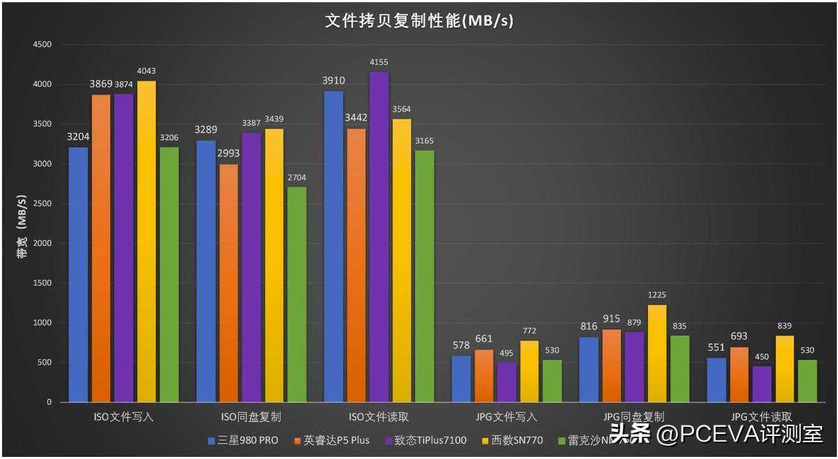 文件拷贝性能:使用全盘SLC策略的西数SN770趁机在写入项目上捞分,作为唯一一款7400MB/s满速,致态TiPlus7100在大文件读取性能上一马当先,但零碎小文件读取则表现欠佳。