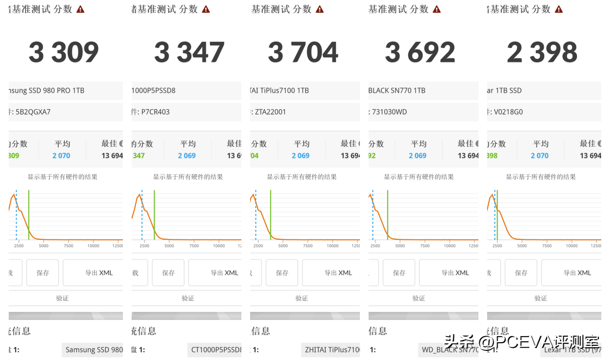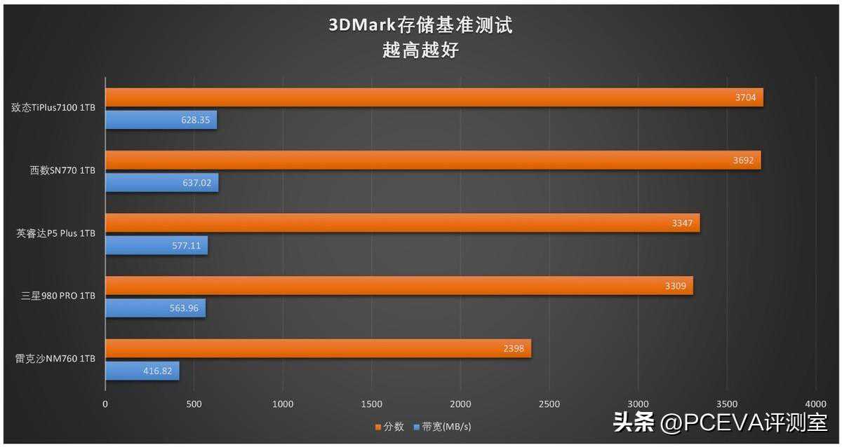 3DMark存储基准测试成绩从高到低分别是:致态TiPlus71001TB、西数SN7701TB、英睿达P5Plus1TB、三星980PRO1TB、雷克沙NM7601TB。
