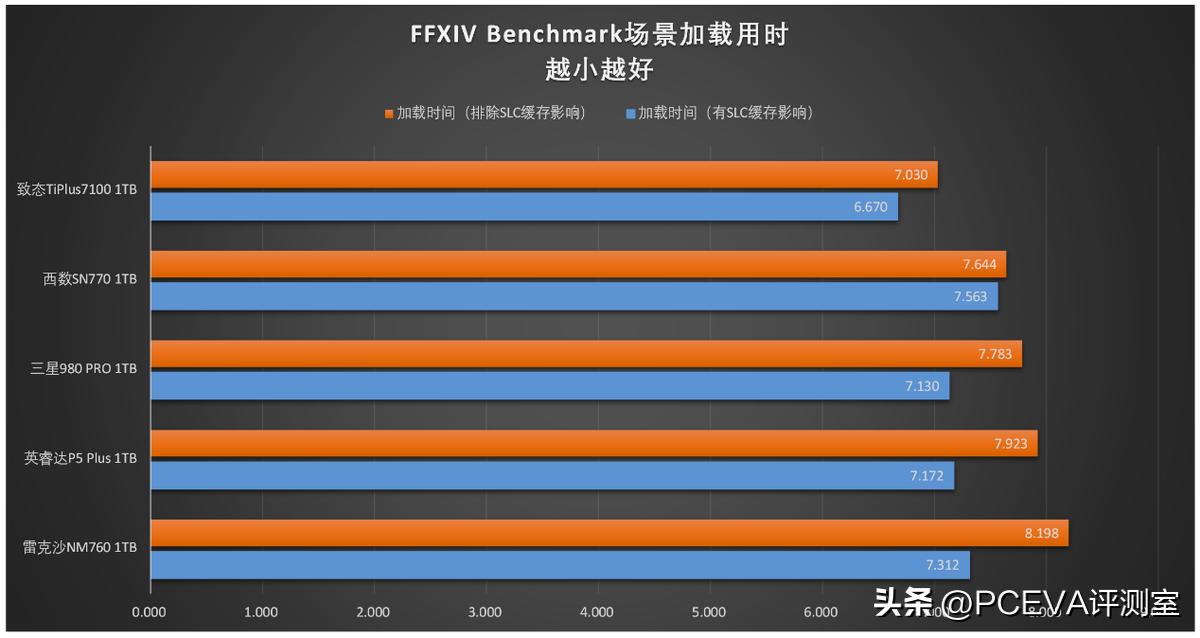 最终幻想14Benchmark包含了多个游戏场景加载用时测试。首先是有持久SLC缓存影响的情况下,所有数据都处于SLC状态。五款SSD当中,致态TiPlus7100是唯一能跑入7秒内的。