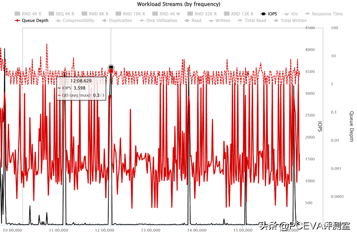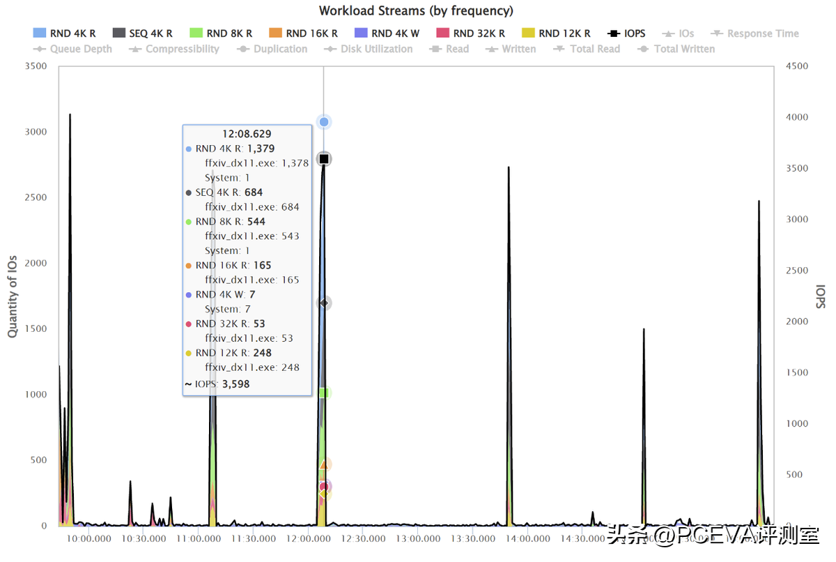 在当前的游戏架构下,SSD主要影响场景加载,也就是读条阶段的性能。而在游戏过程中,硬盘存取活动很少。下图是对最终幻想14Benchmark测试过程的硬盘活动记录分析:几个IO活动尖峰出现在场景加载时,存取模式以4K随机读取为主,并且队列深度很低,缺少并发读取,难以充分发挥SSD的潜力。