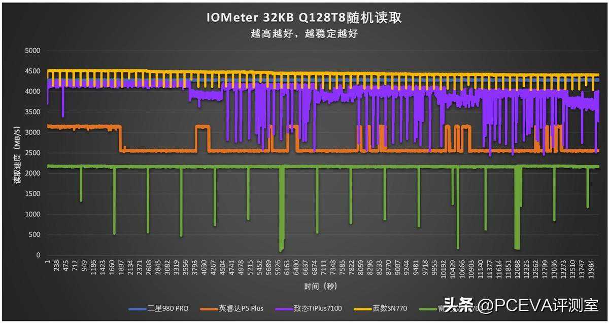 在这个前瞻性的测试项目中,我们通过IOMeter来测试32KB区块多线程、高队列深度随机读取性能,模拟DirectStorage游戏对硬盘的访问方式。32KBQ128T8随机读取4小时测试结果如下: