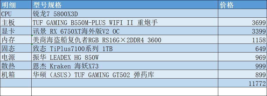 如果说上面几个配置可以拿来办公,这套配置就是拿来纯玩游戏的,基本不带什么办公属性,如果你说码字算不算的话那确实可以,毕竟用了比较好的游戏CPU5800X3D,还是玩游戏更实在些,这个配置2K开光追是没问题的,相比于上一套可以更爽的玩游戏,纯纯的为了游戏的配置