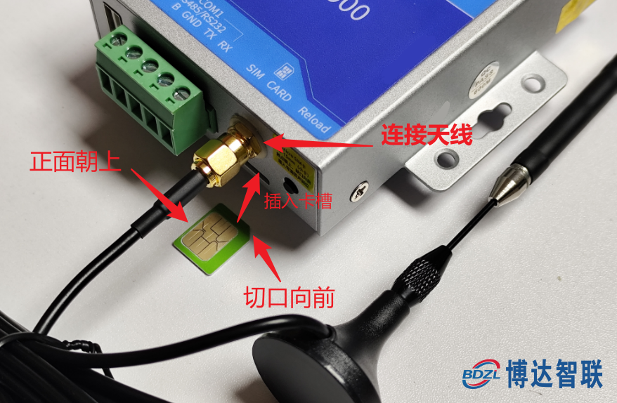 需先按照下方示意图正确插入4G物联网卡以及4G天线