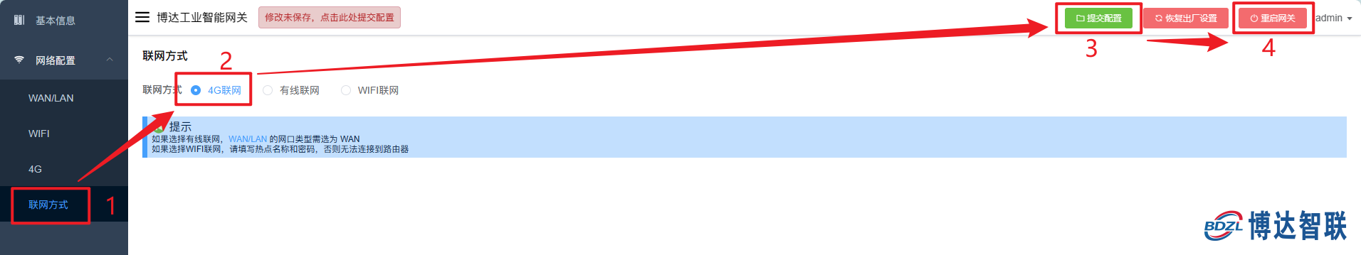 选择4G联网,须在联网方式中选择4G联网,提交配置后重启网关;出厂默认设置为4G联网,无需进行任何配置