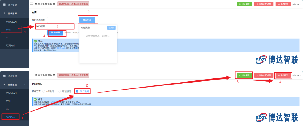 在联网方式中选择WIFI联网,提交配置后重启网关即可