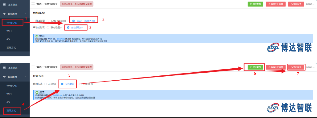 在联网方式中选择有线联网,提交配置后重启网关即可
