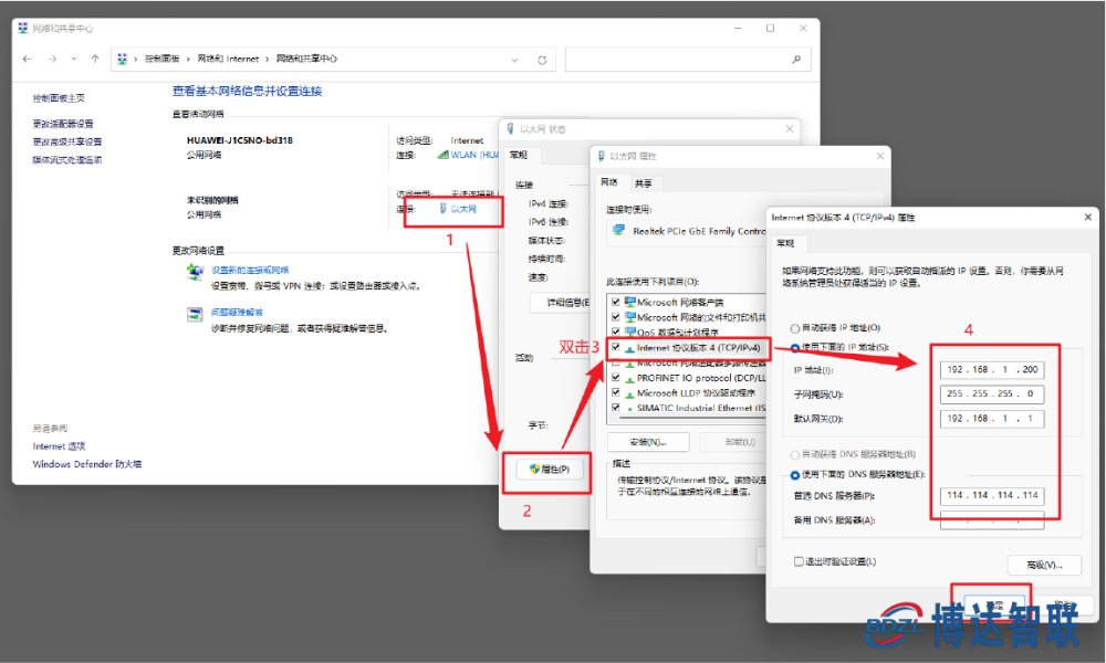 打开控制面板选择与网关相连接的以太网口,在弹框的属性中选择Internet协议版本4(TCP/IPV4),再进入属性里按照图中的IP地址输入静态IP进行配置
