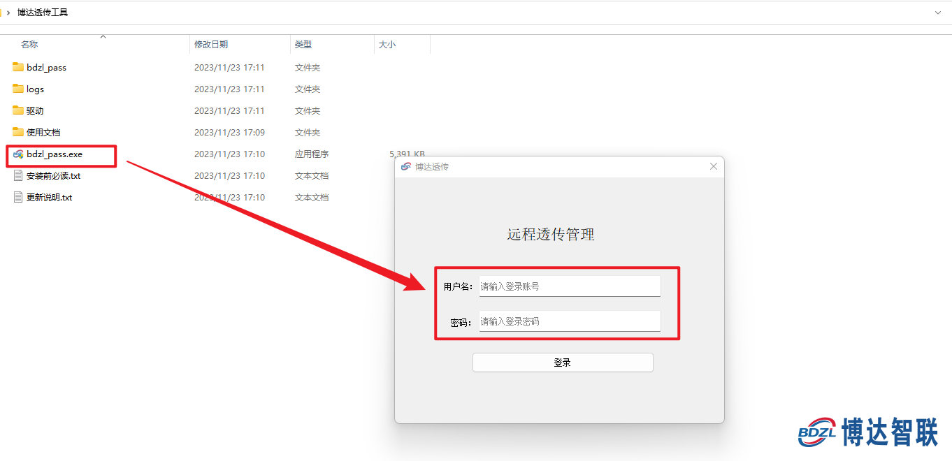 双击打开远程透传工具,输入厂家提供的账号密码进行登录