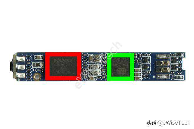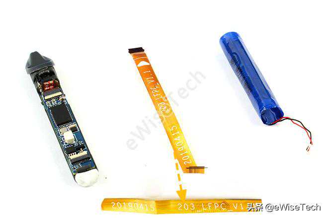 整支笔只在固定主板时使用了一颗螺丝,其他都是依靠塑料与笔杆进行卡位固定,电池为圆柱形电池,上下两端都贴有白色泡棉与两边的主板进行固定。主控芯片选用了定制芯片并采用了市面上比较少见的长方形封装形式,更有利于缩小PCB的宽度。主板和充电板通过一条FPC软排线进行连接,由于结构和PCB板大小的关系,拆解时需要从尾端也就是充电口这一侧进行拆解。高速摄像头通过主板盖的一些限位柱进行固定。整体下来没有一些多余的东西,结构牢固可靠。