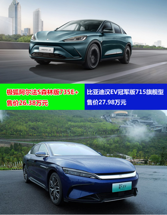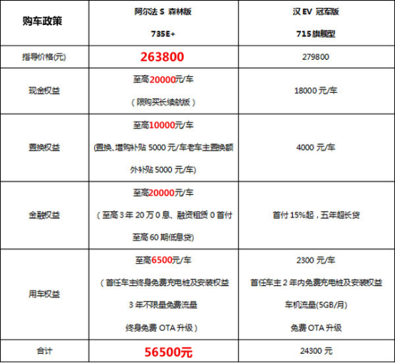 综合购买权益及购买价格后,极狐阿尔法S森林版735E+感知价格为207,300元,比亚迪汉EV冠军版715旗舰型感知价格为255,500元。