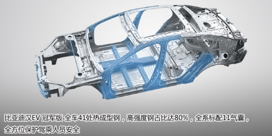 比亚迪汉EV来自“油改电”平台,整车刚度未公布,车身结构采用全钢,焊接工艺。电池包采用塑料底护板,防护性低,防尘防水级别为IP67,曾有自燃事故;悬架为前麦弗逊、后三连杆式,未配备主动预紧式安全带。