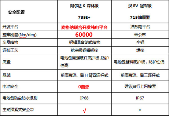阿尔法S森林版有着超越超越宝马7系(42100/°)的钢铝混合笼式结构、航空级钢铝铆接,扭转刚度60000/°,铝合金材质和梯形多连杆结构的悬架其制造成本是目前市场上后悬架成本位于第一梯队的。汉EV则没有公布相关消息。