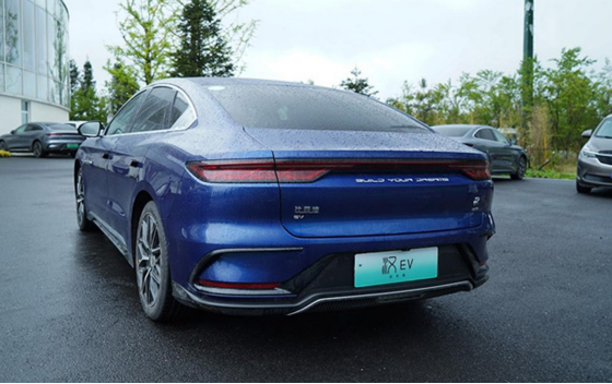 比亚迪汉EV则采用比亚迪家族式设计语言,虽然自2016年发布至今没有较大的更新变化,但布局简洁大气,车身修长,采用全新样式的尾灯设计,车身尺寸4995/1910/1495mm,轴距2920mm。