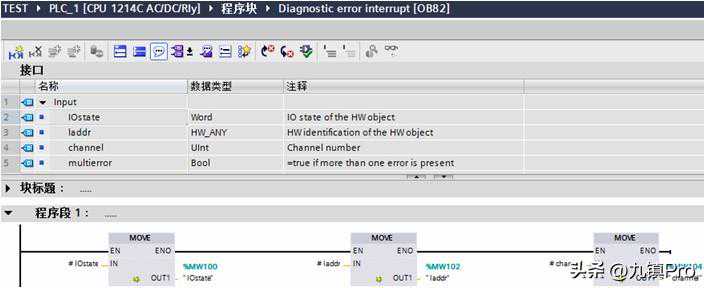 2、OB82中编程如下图,创建地址为MW100、MW102、MW104的变量用于存储出现诊断错误时读取到的启动信息。如图3所示。