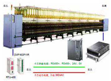 ■稳健方案:利用台达变频器RS485接口的MODBUS通讯功能,配合台达DVP系列PLC的通讯程序,可以在不同纱线长度段改变变频频率,达到产量和质量的最优化。具体配置为:DOP系列触摸屏(或TP系列文本显示器)+DVPES2系列PLC+CT2000变频器。