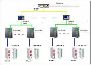 ■优化方案:因台达CT2000变频器内部集成了PLC和文本显示器,用一台CT2000变频器就可以实现触摸屏(或文本显示器)+PLC+变频器的全部功能,借助CT2000内建PLC的MODBUSRS485主站功能,通过远程IO(RTU485模块+IO模块),即可简单构建系统。