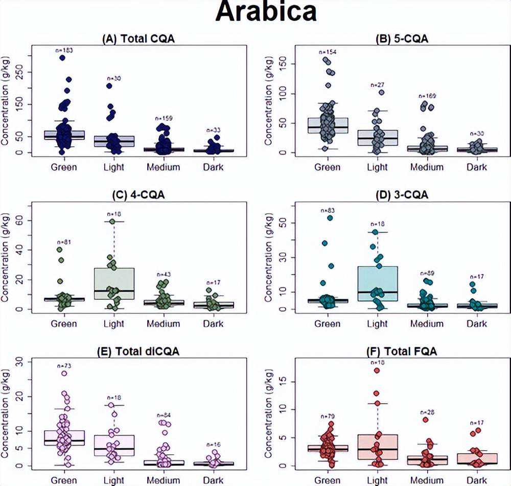 同样,由于烘焙水平是定性的,我们还直接比较了两种咖啡(图7)。绿色阿拉比卡咖啡和绿色罗布斯塔咖啡,以及烘焙阿拉比卡咖啡和烘焙罗布斯塔咖啡,具有相似水平的三种CQA异构体,以及随后的CQA总量(图7A-D)。如上所述,深色烘焙咖啡的所有CGA水平低于生咖啡,但生咖啡和烘焙咖啡之间的差异不太明显,因为所有烘焙水平都组合在一起。除了总FQA和总diCQA之外,咖啡烘焙水平对CGA浓度的影响大于咖啡类型。奇怪的是,在绿色和烤阿拉比卡咖啡和罗布斯塔咖啡中,4-CQA的量是相同的(图7C).绿色罗布斯塔的总FQA和总diCQA水平最高,随着烘烤而降低(图7E-F)。