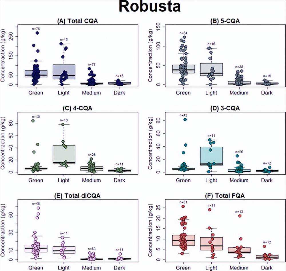 图6.罗布斯塔咖啡中不同烘焙度的绿原酸浓度(g/kg)与定性烘焙度的对比。请注意,每个图都有不同的垂直比例。