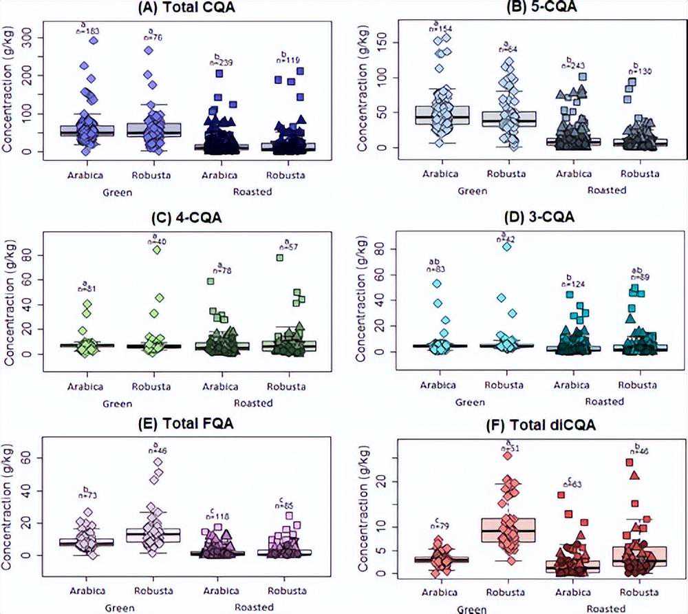 图7.阿拉比卡咖啡和罗布斯塔咖啡的绿原酸浓度(g/kg)比较,无论是生咖啡(未烘焙)还是烘焙咖啡。注意每个图都有不同的垂直比例。根据Fischer的LSD检验,小写字母(ad)表示组间的统计学显着差异。钻石——生咖啡;方块——轻烤;三角形——中度烘焙;圆圈——深色烘焙;倒三角形——烤。