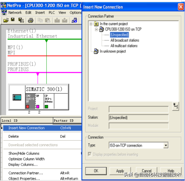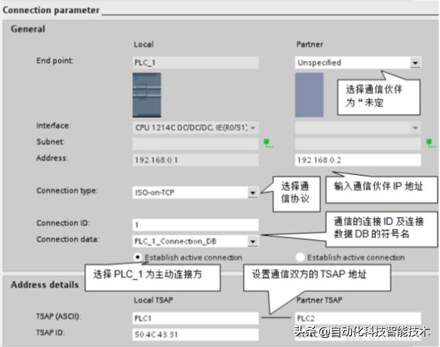 S7-1200CPU与S7-300/400之间通过ISOonTCP通信,需要在双方都建立连接,连接对
