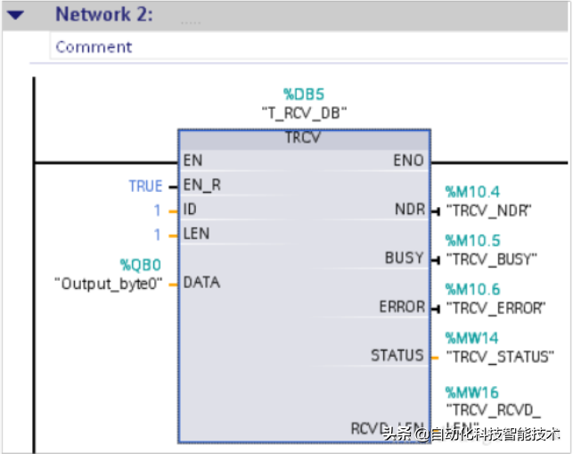 (AG_RECV)通信指令。创建接收数据区为DB2,定义成100个字节的数组。