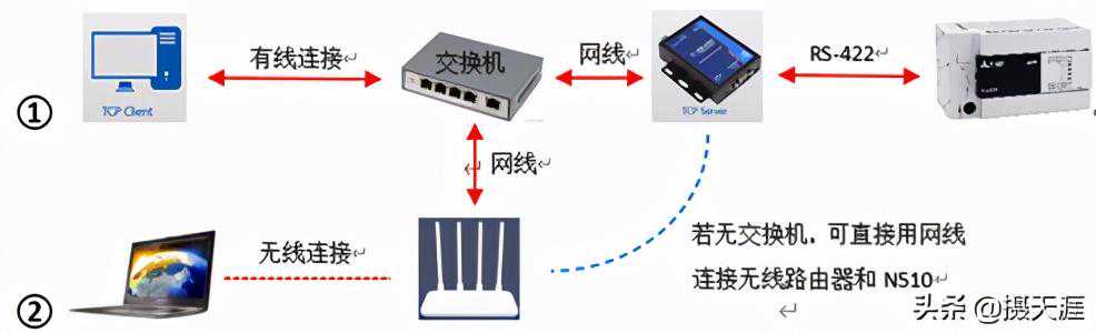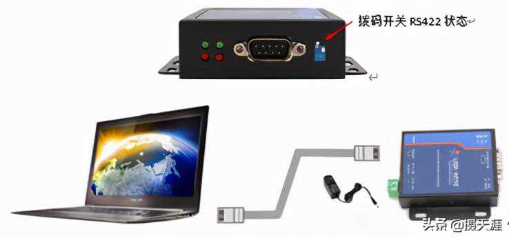 ①N510用网线与PC连接,拨码开关设置成RS422模式,然后再接通12V电源: