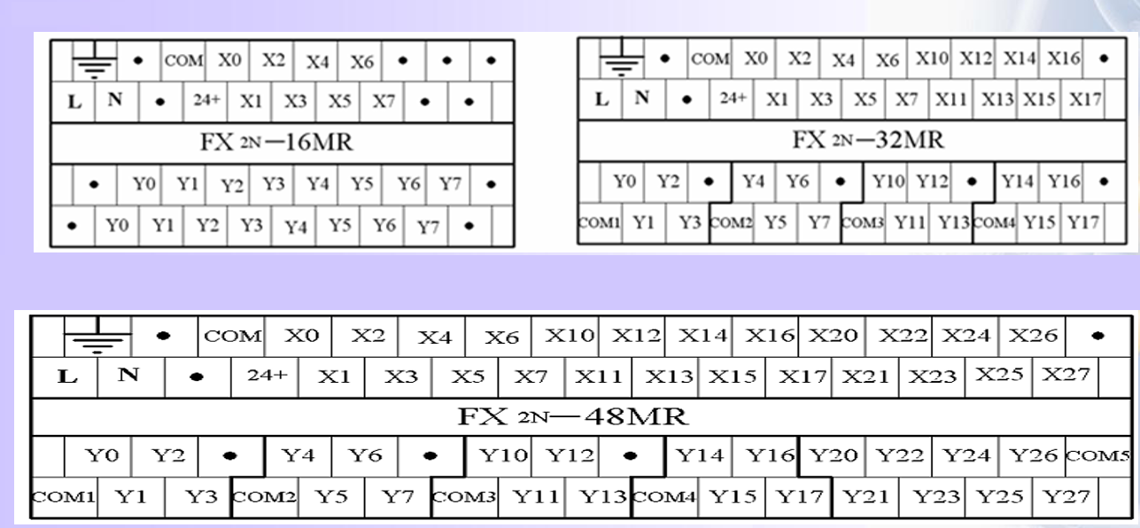 FX2N-16MR、FX2N-32MR、FX2N-48MR三种PLC的I/O端子排列如图