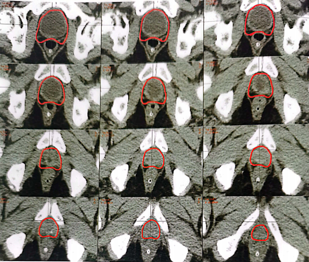 勾画靶区同时需要勾画邻近可能受照射损伤的正常器官,包括直肠、膀胱、股骨头、邻近CTV的小肠、结肠、盆骨等重要器官或结构。直肠从坐骨结节水平勾画至第3骶椎水平(直肠离开骶前处);膀胱勾画全膀胱;股骨头勾画包括股骨头和股骨颈结构;小肠和结肠勾画PTV相应层面及PTV以上3层所有的小肠及结肠体积(包括肠壁和内容物);骶髂骨勾画自腰5椎体以下的骶骨和全部的髂骨,各重要器官的勾画参照RTOG《男性盆腔正常组织勾画指南》。正常组织限量参考RTOG等推荐:膀胱V5050%、V7030%,直肠V5050%、V7025%,结肠Dmax≤54Gy,V5010%,小肠Dmax≤52Gy,V505%,尿道球V5050%、V7030%,股骨头V505%,马尾Dmax≤60Gy。处方剂量前列腺癌术后放射治疗建议采用常规分割方案放疗,单次剂量1.8~2.0Gy,每周5次。在保证正常组织安全的前提下,瘤床推荐剂量为64~72Gy;若存在临床局部复发,放疗剂量需要进一步提高。需要进行盆腔淋巴结引流区照射的患者,预防剂量为45~50Gy;影像学证实的复发盆腔淋巴结,推荐剂量为60~70Gy,在保证正常组织安全的前提下尽可能提高剂量。