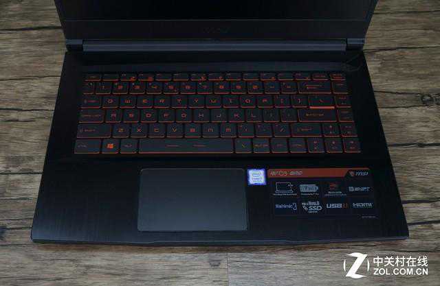 首先是机身A面,大家可以看到GF63采用了经典的红黑游戏风格配色,深红的微星”龙盾“型LOGO与金属拉丝材质的A面完美融合,无论机身质感还是观感都颇具档次。