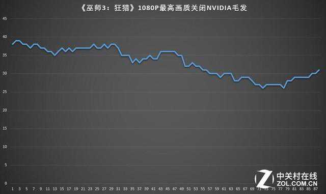 在《巫师3:狂猎》这款沙盒大作的测试中我们开启了1080P最高画质并关闭了NVIDIA毛发特效,在野外骑马进行模拟体验。微星GF63的平均帧数为33.1帧,虽然对于这类第三人称RPG游戏来说可以勉强接受,但最好还是合理的调整一下诸如阴影、树叶绘制距离等设置来获得更理想的帧数。