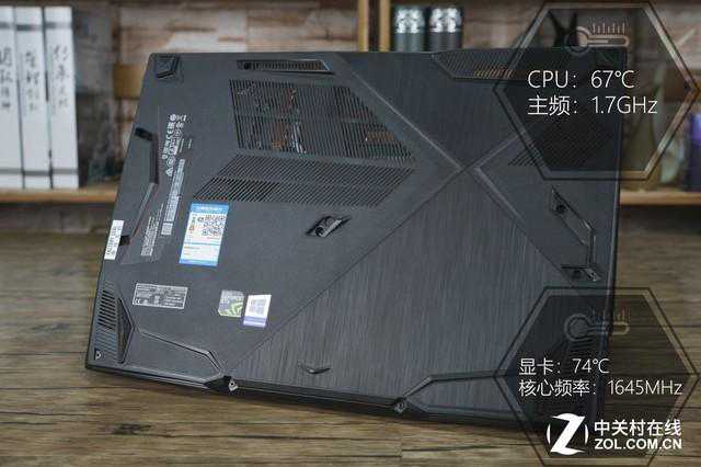 最后是散热效能环节,我们使用AIDA64对微星GF63进行双拷测试,两分钟后CPU温度维持在67度附近,CPU功耗25W,主频1.7GHz,而显卡温度为74度,核心频率1645MHz。从结果来看微星GF63对于CPU功耗进行了限制,因此主频偏低且拷机温度较低,对于轻薄游戏本来说这是可以理解的设计,显卡的表现比较正常,温度控制良好。